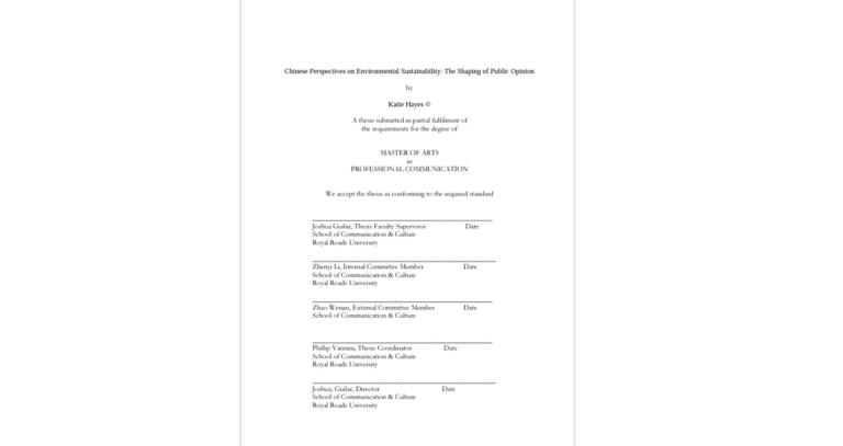 Urban health risk and resilience in Asian cities Singh, R. B., Srinagesh, B., & Anand, S. (2020) [Ebook] Governing water in India: Inequality, reform, and the state Fernandes, L. (2022) [Open Access Ebook] Engendering climate change: Learnings from South Asia Hans, A., Rao, N., Anjal, P., & Patel, A. (Eds.). (2020) [Open Access Ebook] Empire and environment: Ecological ruin in the Transpacific Ana, J. S., Amin-Hong, H., Chua, R. G., & Xiaojing, Z. (Eds.). (2022) [Open Access Ebook] Sustainable development goals: An Indian perspective Hazra, S., & Bhukta, A. (2020) [Ebook] Depopulation, deindustrialisation and disasters Shiraishi, K., & Matoba, N. (Eds.). (2019) [Ebook] Design and technological applications in sustainable architecture Lau, S. S. Y., Li, J., Hao, S., & Lu, S. (Eds.). (2021) [Ebook] Urban residents' perception and behaviour of climate change in Tianjin, ChinaLi, B. (2023) [Master’s Thesis, Royal Roads University] No doggy bag please: Chinese attitudes on food wasteLeung, H. (2015) [Master’s Thesis, Royal Roads University] Chinese perspectives on environmental sustainability: The shaping of public opinionHayes, K. (2010) [Master’s Thesis, Royal Roads University]